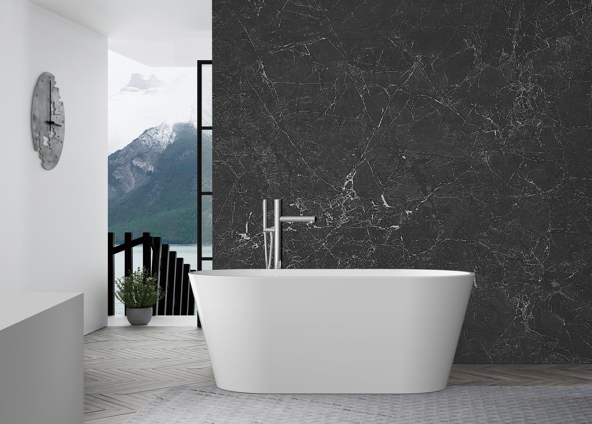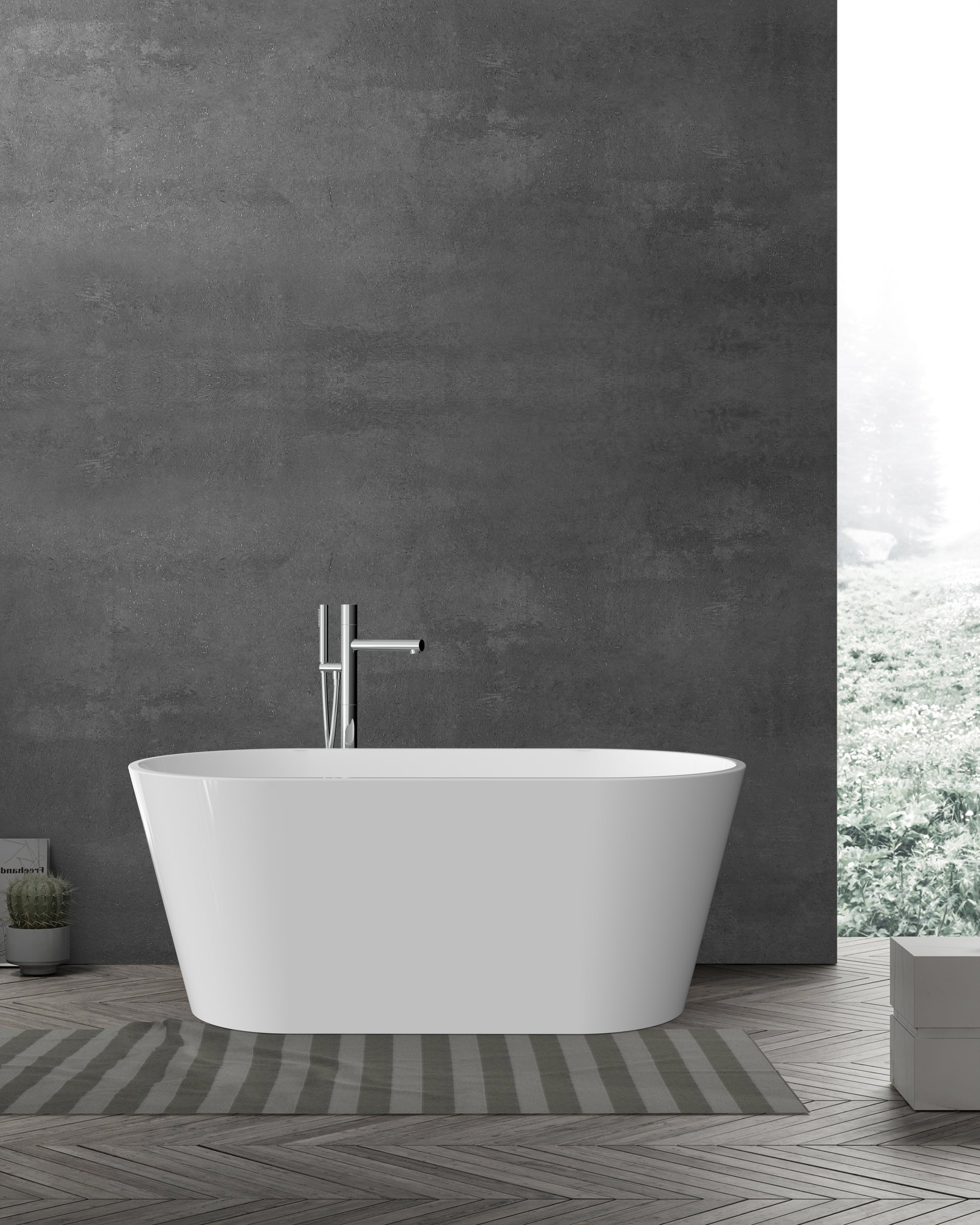 Crafted with high-quality acrylic and strengthened with resin and fiberglass, Bauhaus Nova freestanding bathtub features a built-in chrome overflow, chrome pop-up waste, and a durable stainless steel frame with adjustable legs.